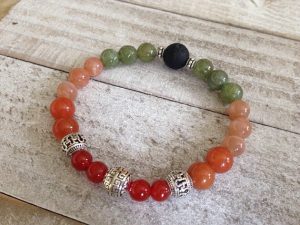 This very special bracelet was designed specifically to symbolize the highly intelligent and gentle orangutan. Orangutan meaning “person of the forest” is represented with Green Apatite, a humanitarian stone associated with animal conservation. It is comprised of the mineral phosphate that makes up the teeth and bones of all vertebrate animals. Green Apatite is called “bones of the Earth” and is one of the best crystals used to heal the earth. Peach Moonstone is all about Love, Mothering, Intuition, and Wisdom. Orange Adventurine stands for Creativity, Imagination, Independence, and Balance. Finally, Carnelian represents Appreciation of Nature, Harmony, Courage, and Happiness. The amazing balance of qualities these gemstones hold allow us to feel a special connection to the beloved red ape of the rainforest.